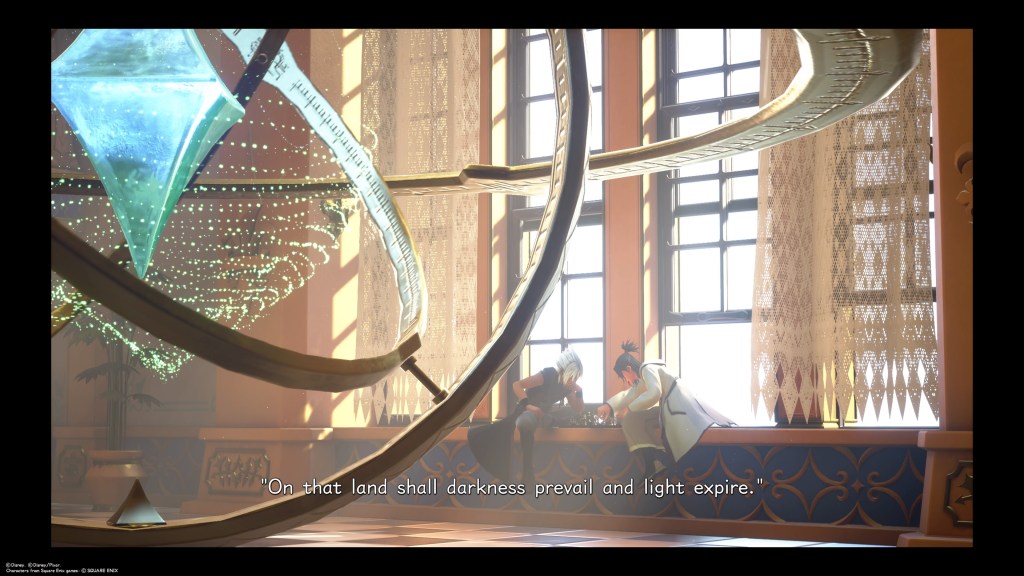 The opening was kinda confusing and weird with these two guys playing chess. I think it might’ve been Terra and his teacher guy from Birth By Sleep, but I dunno.